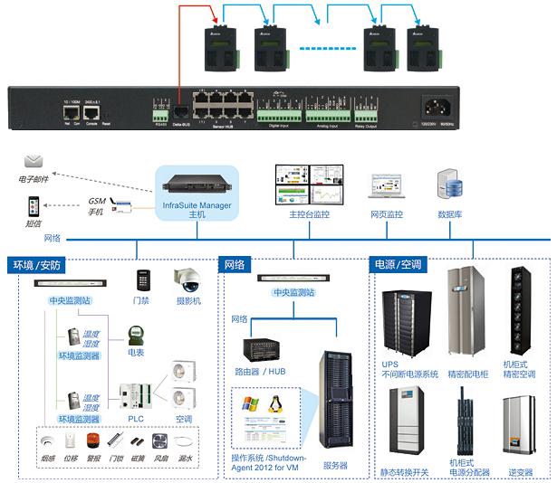 • 中央監(jiān)測站及環(huán)境監(jiān)測器系列可以將偵測到的環(huán)境參數(shù)(溫度、濕度、漏水、煙霧、門窗…)回傳InfraSuite Manager。經(jīng)由InfraSuite Manager判斷后下達互動指令。